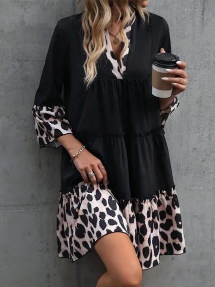 Kadın Fakir Kol V Yakalı Leopar Desen Detaylı Trikoton Elbise