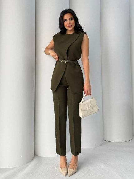 Kadın Uzun Kollu Bisiklet Yaka çift Renkli Viskon Iki Iplik Bluz Ve Pantolon Ikili Takım