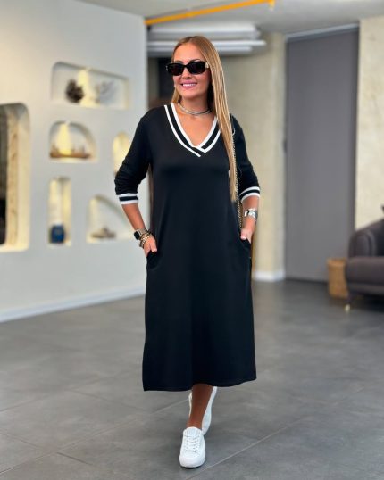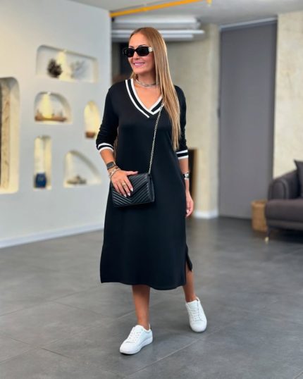 Kadın Askılı V Yakalı önü Düğüm Detaylı Viskon Elbise