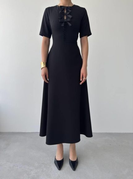 Kadın Uzun Kollu Bisiklet Yaka Kollar Tül Kelebek Detaylı Ithal Krep Elbise