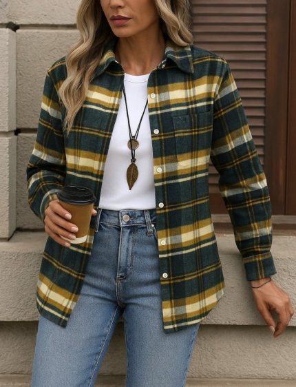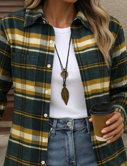 Erkek Ekose Desenli Düğmeli Polar Yakalı Uzun Kollu Gömlek Oversize Rahat Kalıp – Yeşil