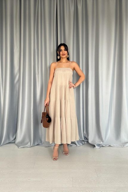 Kadın Askılı V Yakalı Etnik şerit Detaylı Uzun Viskon Elbise