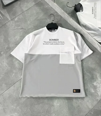 Unisex Torba Cep Detaylı Parçalı T-Shirt – Gri