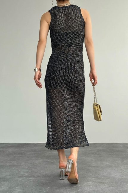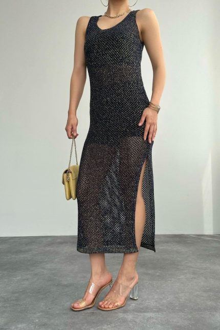 Simli Ajurlu Uzun Elbise – Lacivert-Sarı
