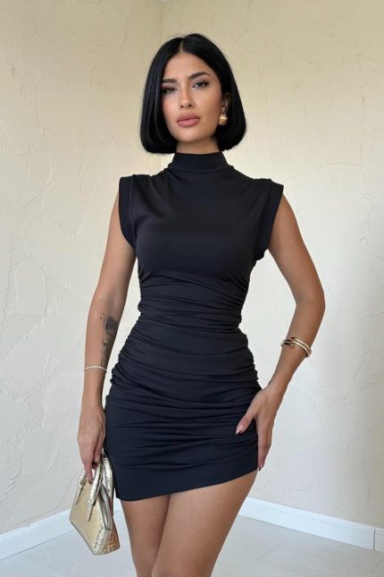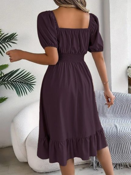 Kadın Kısa Kollu Kare Yakalı Beli Lastikli Kısa Trikoton Elbise