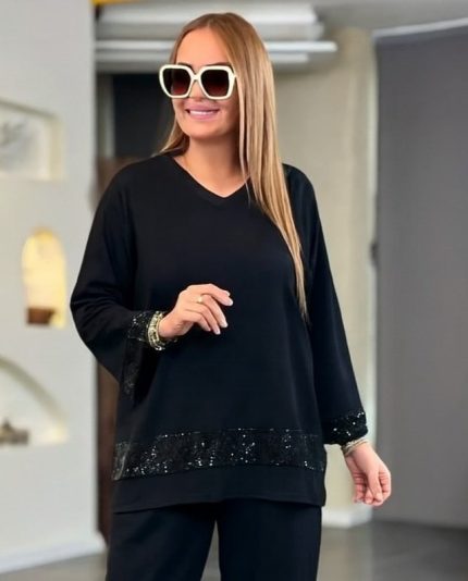 Kadın Uzun Kollu V Yakalı Pulpayet Viskon Iki Iplik Bluz Ve Pantolon Takım