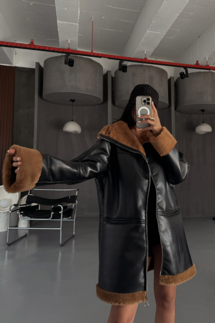 DERİ MONT KOL VE YAKA PELUŞ KAPAKSIZ CEP DETAYLI – Siyah-Taba