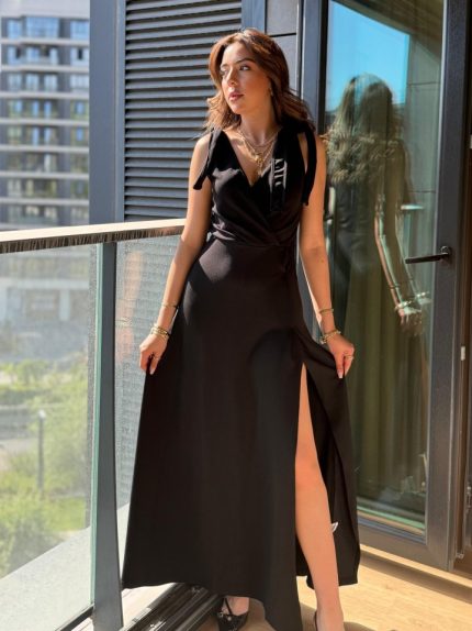 Kadın Askılı Omuzdan Bağlamalı Kruvaze Yakalı Uzun Yırtmaçlı Janjan Krep Elbise