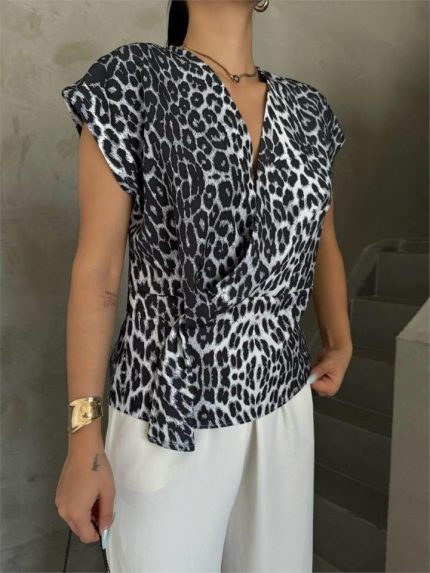 LEOPAR DESEN YANDAN BAĞLAMA DETAYLI BLUZ – Gri
