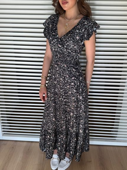 Kadın şifon Kumaş Astalı Kloş Kesim Kruvaze Yaka Midi Boy Elbise