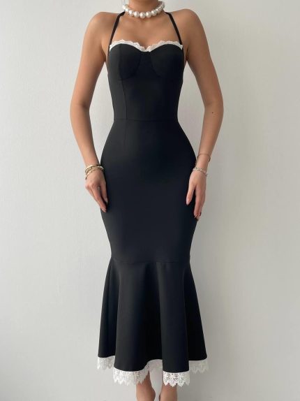 Kadın Halter Yaka Simli Kumaş Sırtı Bağcık Detay Prenses Elbise