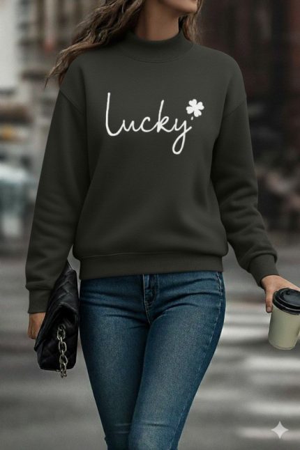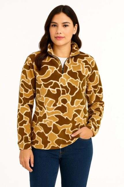 KADIN Yarım Fermuarlı Desenli Polar Sweat Yakalı, Uzun Kollu, Oversize Rahat Kalıp – Kahverengi