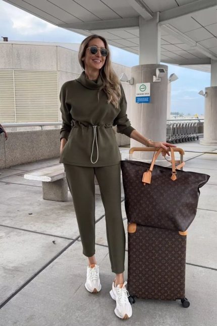 Kadın Uzun Kollu Balıkçı Yaka Belden Lastikli Modal Bluz Ve Pantolon Ikili Takım
