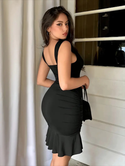 Kadın Askılı Derin V Dekolteli Fırfırlı Janjan Krep Elbise