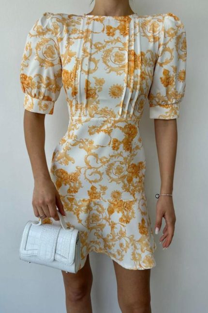 Kadın Kısa Kollu Yakası Bağcıklı önden Düğmeli Fırfır Desenli Süprem Elbise