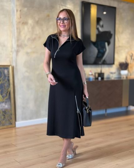 Kadın Kısa Kollu V Yaka Ve Yaka Ribana Detay Midiboy Viskon Elbise