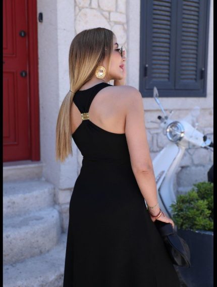 Kadın Omuzlardan Açık Arkadan Aksesuar Detaylı Yırtmaçlı Janjan Krep Elbise
