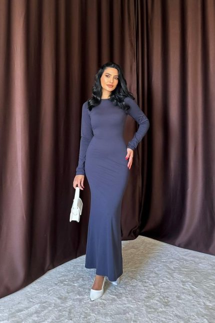 Kadın Uzun Truvakar Kol Bisiklet Yaka Midi Modal Elbise