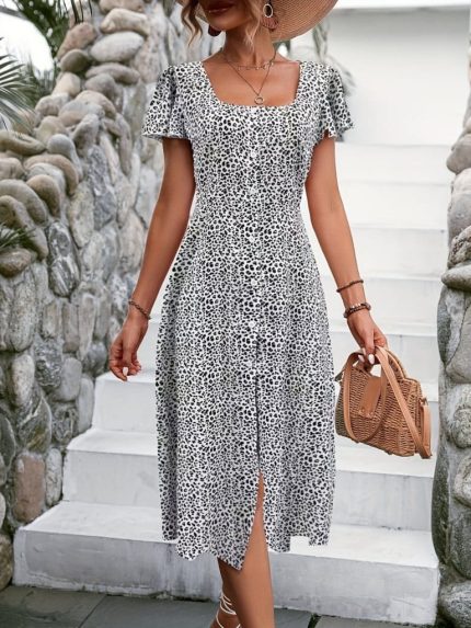 Kadın Kısa Kollu Kare Yaka önden Düğmeli çiçekli Süprem Elbise