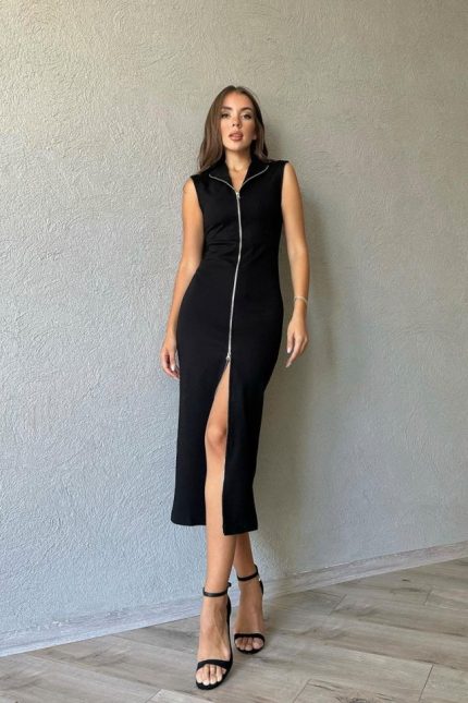 Siyah Boydan Fermuarlı Sıfır Kol Elbise