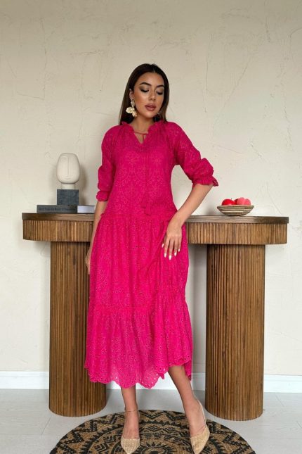 Kadın Uzun Kollu Yarı Balıkçı Yaka Etek Ucu Fırfır Detaylı Midi Ithal Krep Elbise
