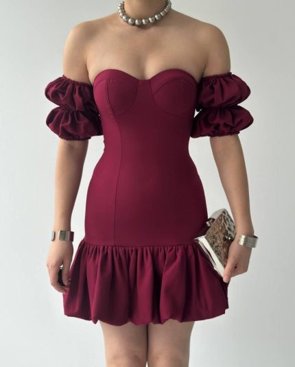 Kadın Uzun Kollu V Yakalı Taşlı Mini Ithal Krep Elbise