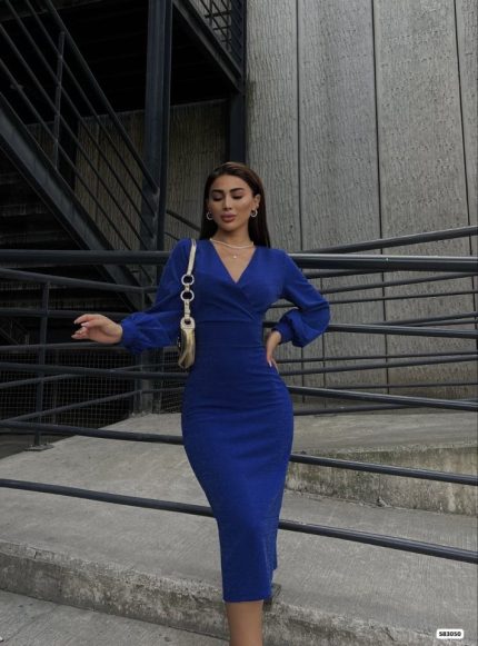 Kadın Uzun Kollu Kruvaze Yaka üst Modal Alt Ithal Krep Mini Elbise