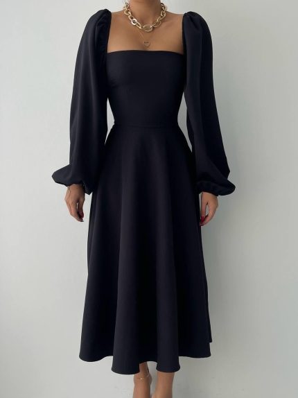 Kadın Uzun Kollu Fermuar Detay Fitilli Kaşkorse Kumaş Maxi Boy Elbise