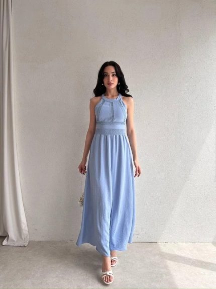 Kadın Krinkil Kumaş Beli Gipeli Halter Yaka Maxi Boy Elbise
