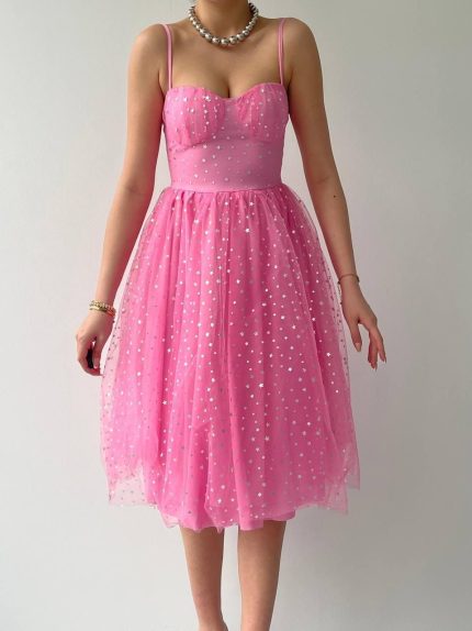 Kadın Omuz Askılı Kuş Gözü Zincir Detay Sandy Kumaş Maxi Boy Elbise