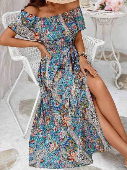 Kadın Kısa Kollu Madonna Yaka Fırfırlı Belden Yırtmaçlı Maksi Süprem Elbise