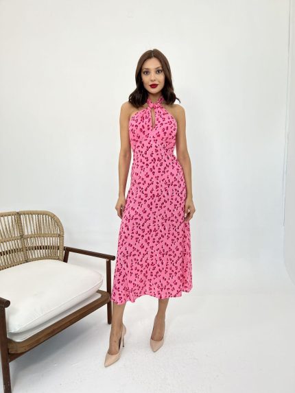 Kadın Balıkçı Yaka Sırt Dekolteli Leopar Desen Maxi Boy Elbise