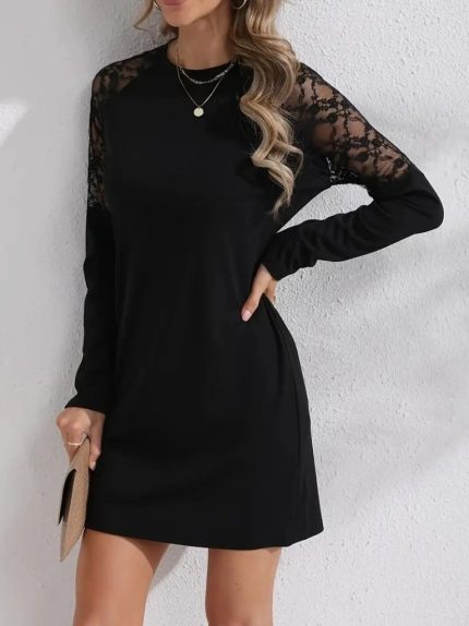 Kadın Uzun Kollu Bisiklet Yaka Dantel Detaylı Visk8n Iki Iplik Düğmeli Mini Elbise