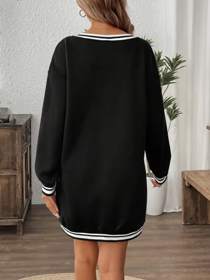 Kadın Uzun Kollu V Yakalı şerit Detaylı Kısa Viskon Iki Iplik Elbise