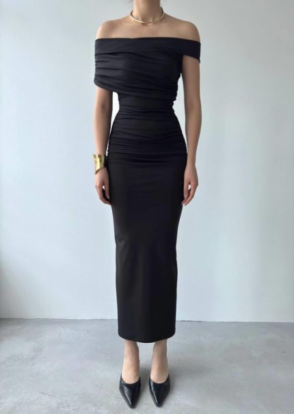 Kadın Sıfır Kol Sıfır Yaka Drape Detaylı Midi Janjan Krep Elbise