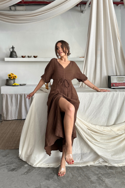 V YAKA BEL BONCUK BAĞLAMALI MÜSLİN ELBİSE YIRTMAÇ DETAYLI – Kahverengi