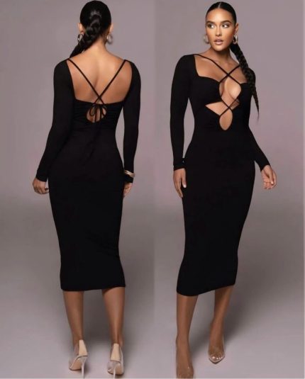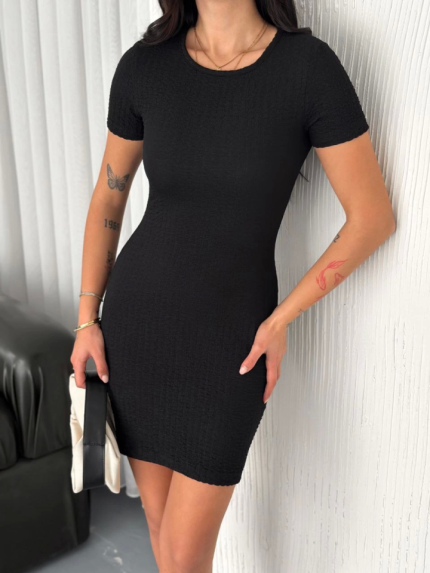 Bisiklet Yaka Kısa Kol Likralı Elbise – Siyah