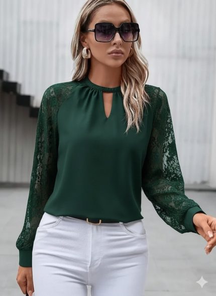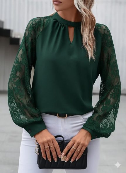 Kadın Uzun Dantel Kollu Yuvarlak Yakalı Sandy Bluz