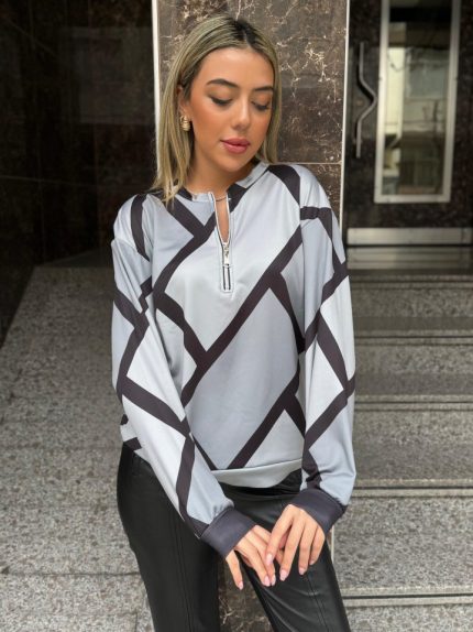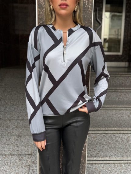 Kadın Uzun Kollu Yuvarlak Yaka Fermuarlı Desenli şardonlu Bluz