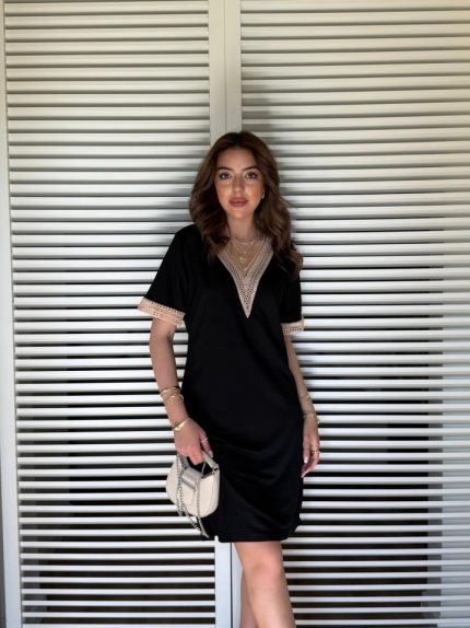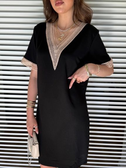 Kadın V Yaka Güpürlü İki İplik Elbise