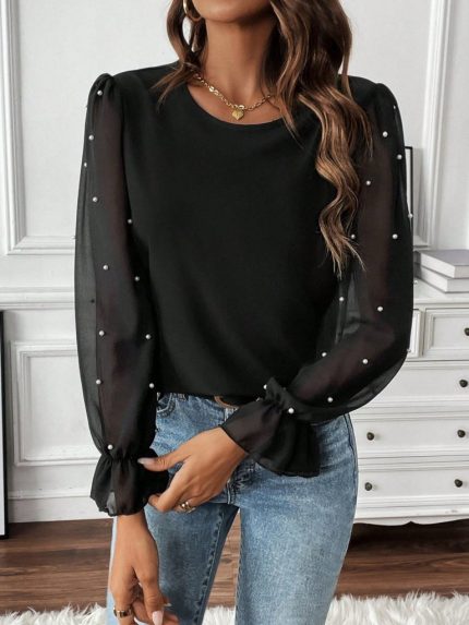 Kadın Uzun Kollu Bisiklet Yaka Tül Detaylı Incili Ithal Krep Bluz