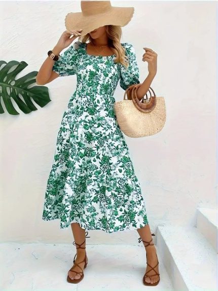 Kadın Kısa Kollu Kare Yakalı Lastikli Desenli Süprem Elbise