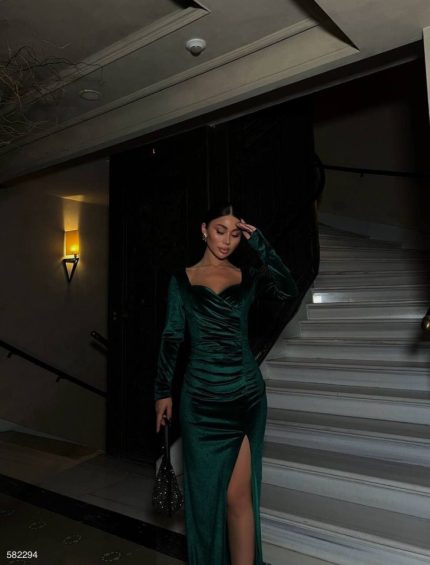 ₺900,00Kadın Kadife Kumaş Kalp Yaka Yırtmaç Detaylı Maxi Boy Elbise