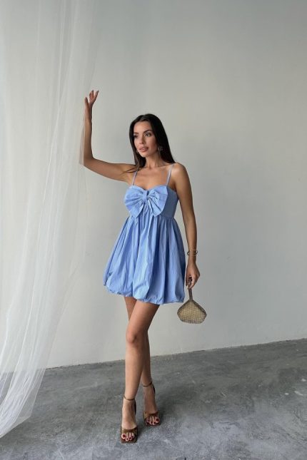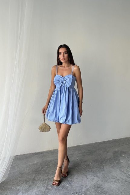 Mavi Önü Fiyonklu Askılı Elbise