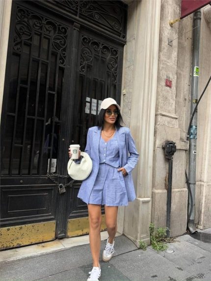ÇİZGİLİ KETEN CEKET YELEK ŞORT TK – Mavi