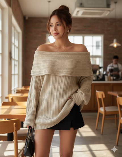 Kadın Uzun Kollu Katlama Detay Madonna Yaka Salaş Kazak