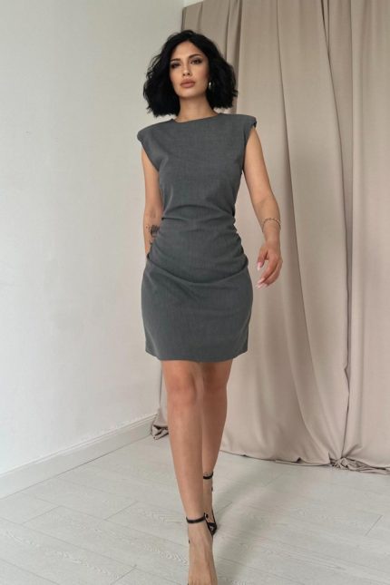 Gri Yanı Büzgülü Sıfır Kol Elbise