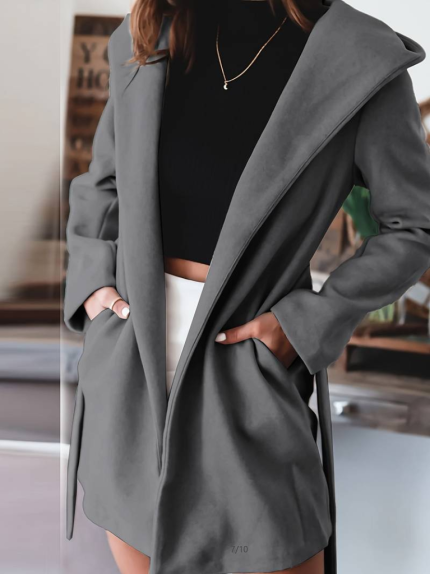 Kadın Uzun Kollu Belden Kuşaklı Kapşonlu Kısa Kaşe Kaban