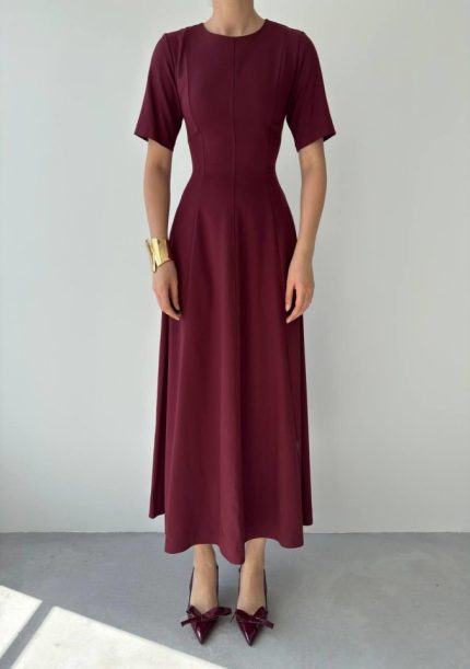 Kadın Kısa Kollu Madonna Yaka Belden Oturtmalı Uzun Ithal Krep Elbise