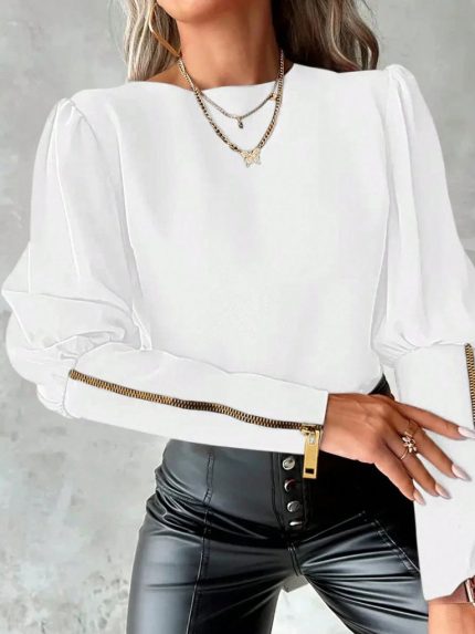 Kadın Uzun Kollu Bisiklet Yaka Fermuar Detaylı Ithal Krep Bluz